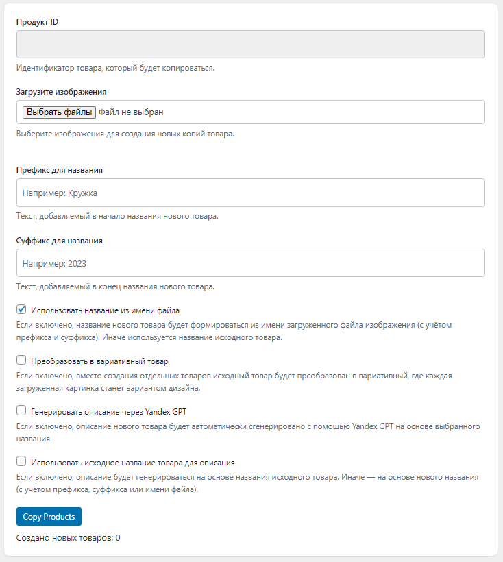 Bulk Product Copier — удобный плагин для WooCommerce, который помогает копировать товары и создавать из них как вариативные, так и обычные продукты. Добавляйте новые варианты с уникальными картинками и атрибутами (например, «Дизайн 1», «Дизайн 2») для вариативных товаров или дублируйте товары как есть. Благодаря интеграции с Yandex GPT Product Filler, плагин может автоматически генерировать подробные описания товаров с помощью искусственного интеллекта Yandex GPT, экономя ваше время. Идеально для магазинов с большим ассортиментом — управляйте товарами легко и быстро!