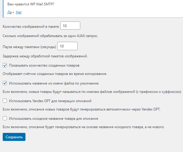 - Если описания не генерируются, проверь настройки Yandex GPT Product Filler и наличие API-ключа.